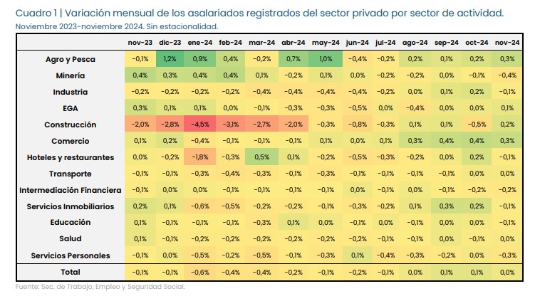 El informe identifica tres fases en la evolución reciente del empleo privado: una contracción pronunciada durante el primer semestre de 2024, una recuperación parcial en la segunda mitad de ese año y un comportamiento oscilante en 2025. Este patrón coincide con la estrategia económica del Ejecutivo: una liberalización abrupta en los primeros meses, seguida por un intento de estabilización a partir del llamado “Plan Motosierra 2.0”.