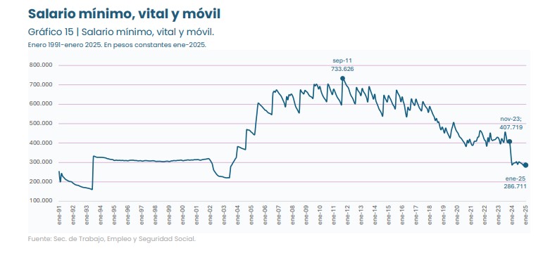 El salario mínimo, vital y móvil —referencia para amplios segmentos del trabajo informal y para programas sociales— volvió a caer en términos reales. Entre noviembre de 2023 y agosto de 2025 su poder adquisitivo se redujo 32 %, y solo en el último año la pérdida fue de 3,7 %. En valores constantes, el salario mínimo de agosto equivale a menos que el de 2001, antes del colapso de la convertibilidad.