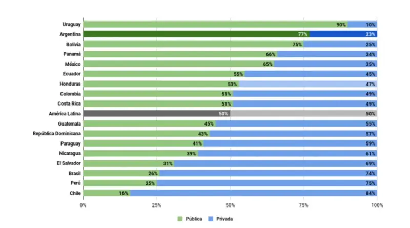Argentina es el segundo país en Latinoamérica con mayor porcentaje de estudiantes en universidades públicas, según datos publicados por la UNaHur en mayo de 2024. El sistema universitario se multiplicó por más de siete desde el retorno de la democracia. Las cifras relevadas indican que prácticamente 8 de cada 10 estudiantes asisten a instituciones públicas del nivel superior, mientras que en México lo hacen poco más de 6, en Colombia 5, en Brasil y Perú algo menos de 3, y en Chile apenas 1,6 de cada 10 estudiantes son cubiertos por el sistema estatal.