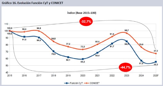A su vez, en el informe del Grupo EPC se explica que “este nivel de presupuesto para la FCyT implica un ajuste sostenido en el periodo 2024-2025 que alcanza un deterioro del 34,8% en términos reales en dos años”.