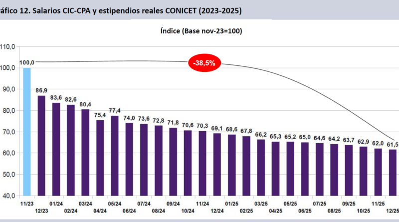 Con Milei, la inflación acumuló un aumento del 259,4%, mientras que los ingresos en CONICET subieron un 121,2%. La pérdida de docentes e investigadores en universidades llega es de 120 puntos contra la inflación.