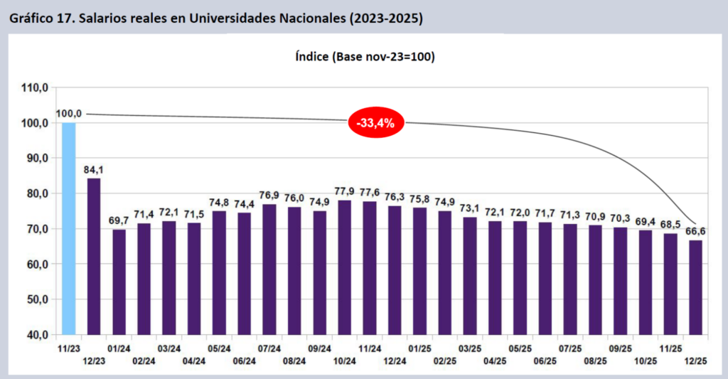 Por su parte, las remuneraciones del personal encuadrado en el Sistema Nacional de Empleo Público cayeron un 0,8% en términos reales durante diciembre de 2025 y, así, acumularon una pérdida de 29,9% desde noviembre de 2023.