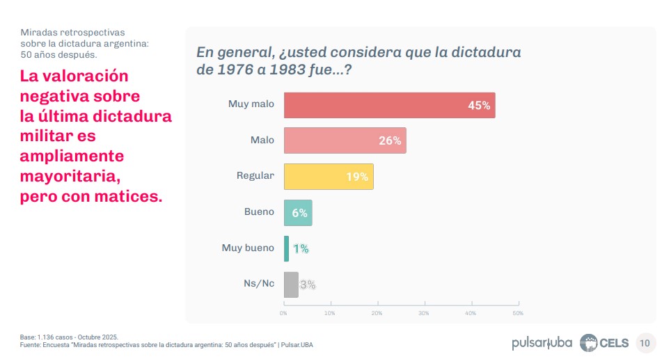 El sociólogo Máximo Reina, integrante del Observatorio Pulsar de la UBA, explicó que uno de los principales hallazgos es que el período 1976-1983 sigue siendo un tema vigente en la memoria colectiva. “El 71% de la población afirma conocer mucho o bastante sobre este período”, señaló, al tiempo que remarcó que no se trata de un tema olvidado ni marginal .