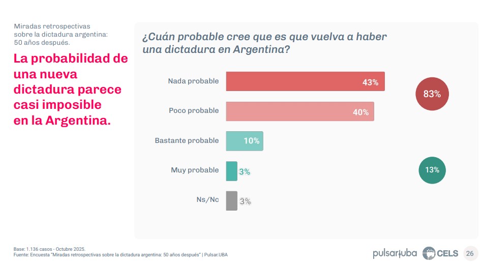 Uno de los datos más significativos del relevamiento es la percepción sobre el presente: la posibilidad de un nuevo golpe de Estado aparece prácticamente descartada. “Hoy hay una noción de que vuelva a haber un golpe en la Argentina es algo absolutamente impracticable, impensado”, afirmó el sociólogo, quien vinculó esta mirada a cambios culturales y generacionales .