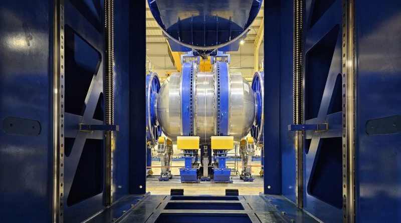 Durante la última semana de junio se llevó a cabo en el Centro Espacial Punta Indio de la CONAE, un ensayo hidráulico para evaluar el comportamiento mecánico del prototipo de tanque de primera etapa del Tronador II-250.