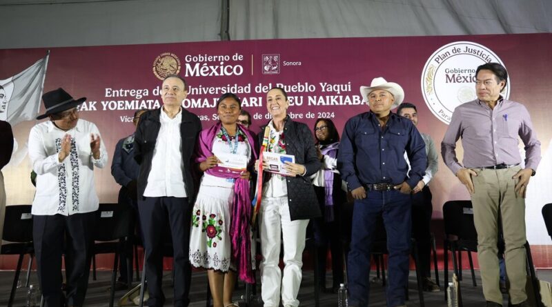 La presidenta de México, Claudia Sheinbaum, inauguró este sábado la primera universidad del pueblo yaqui, dedicada a formar profesionistas en los pueblos originarios en los alrededores de Vícam, capital de la región indígena que habita en el norteño estado de Sonora.