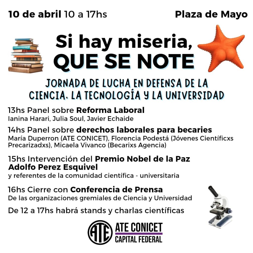 En CABA, la jornada iniciará con un acto con la presencia de les secretaries generales de ATE y sindicatos universitarios y luego una panel con la participación de Adriana Serquis y de referentes del Sistema Científico Tecnológico.