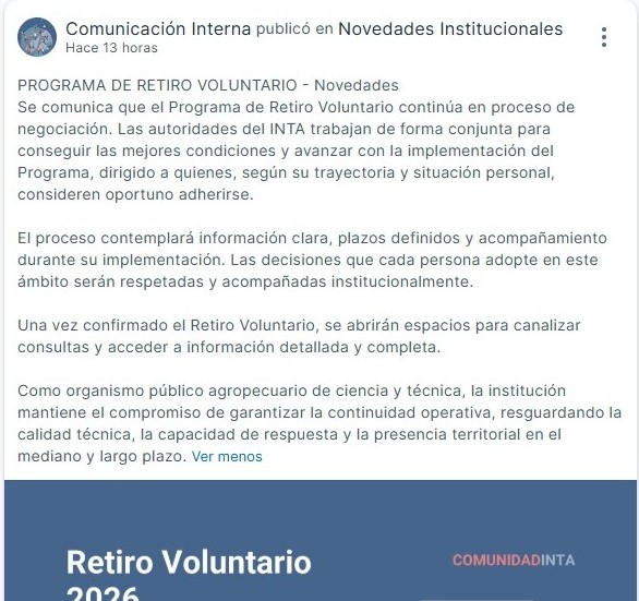 “Como organismo público agropecuario de ciencia y técnica, la institución mantiene el compromiso de garantizar la continuidad operativa, resguardando la calidad técnica, la capacidad de respuesta y la presencia territorial en el mediano y largo plazo (?)”, cierra el comunicado.