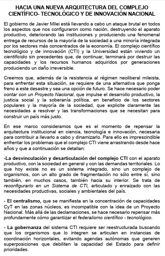 El gobierno de Javier Milei está llevando a cabo un ataque brutal en todos los aspectos que nos configuraron como nación, destruyendo el aparato productivo, deteriorando las instituciones y produciendo una fenomenal entrega de recursos de la mayoría de la sociedad a una minoría integrada por los sectores más concentrados de la economía“, sostiene el documento que apunta contra el “cientificidio” del gobierno nacional.