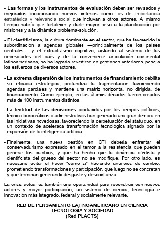 Además, hicieron hincapié en el cientificismo, la cultura dominante en el sector, que ha favorecido la subordinación a agendas globales; La extrema dispersión de los instrumentos de financiamiento que debilita su eficacia estratégica, profundiza la fragmentación favoreciendo agendas parciales y mantiene una matriz horizontal, no dirigida, de financiamiento.
